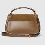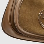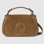 The new Gucci Blondie bag, whose distinctive logo first appeared in the House’s collections in the early 1970s, weaves together past and present in a fusion of nostalgia and modernity. This medium top handle bag is crafted from brown suede, featuring the House’s round symbol in enamel. The style is complete with a leather top handle and detachable, adjustable shoulder strap.