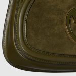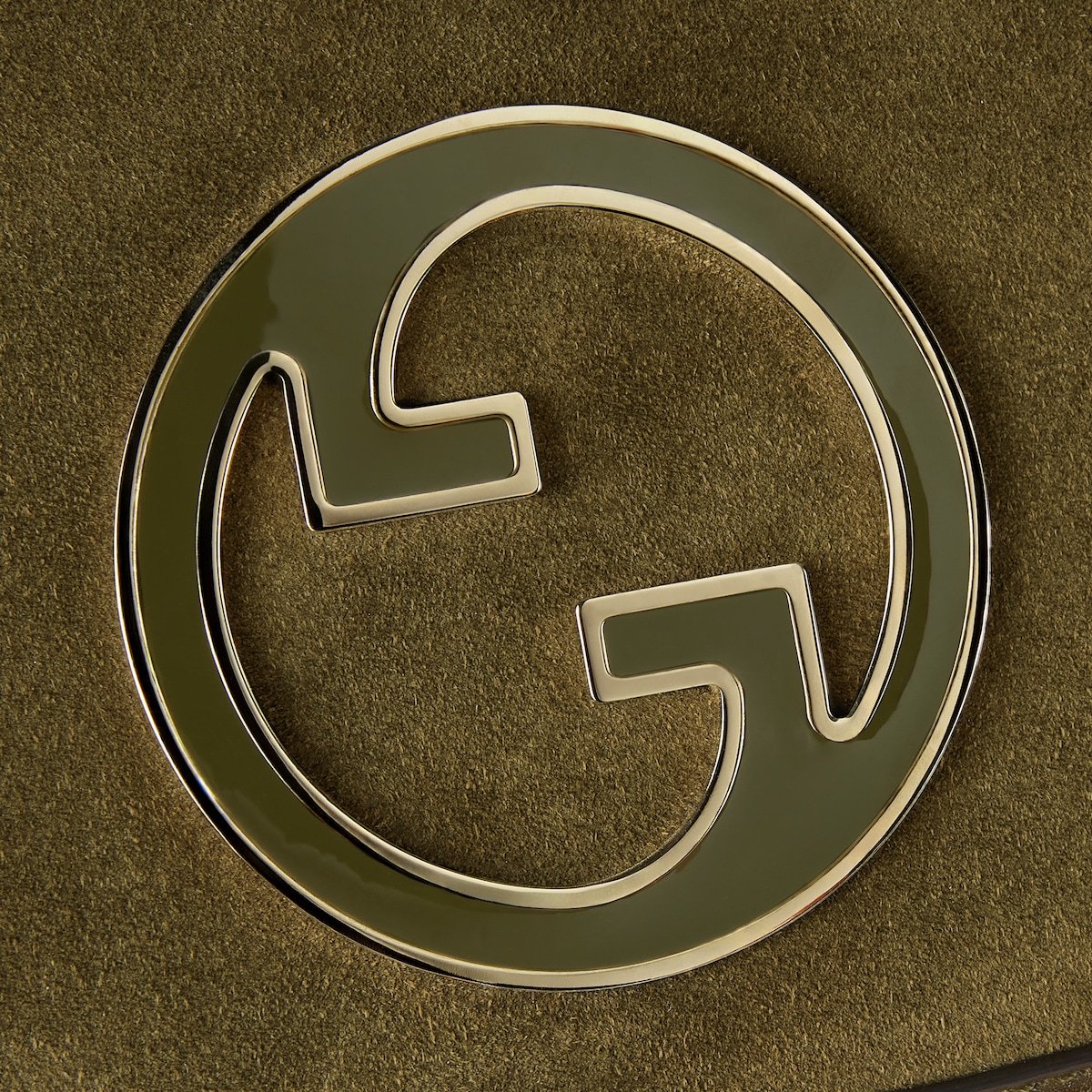 The new Gucci Blondie bag, whose distinctive logo first appeared in the House’s collections in the early 1970s, weaves together past and present in a fusion of nostalgia and modernity. This small shoulder bag is crafted from dark green suede, featuring the House’s round symbol in enamel. The gold-toned chain and leather strap can be worn on the shoulder or crossbody.
