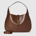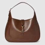 In the Spring Summer 2024 collection, the Gucci Jackie shoulder bag features premium fine leather which highlights the craftsmanship, crescent shape, and sleek silhouette of the House’s iconic shoulder bag. Light gold-toned hook closure, leather trim, and an additional green and red Web strap gives this Gucci Jackie medium shoulder bag in brown leather further styling options.