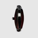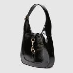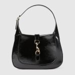 The new Gucci Jackie is crafted from fine leather which highlights the craftsmanship, crescent shape, and sleek silhouette of the House’s iconic shoulder bag. Light gold-toned hook closure, leather trim, and an additional strap featuring the green and red Web gives this Gucci Jackie small shoulder bag in black patent leather further styling options.