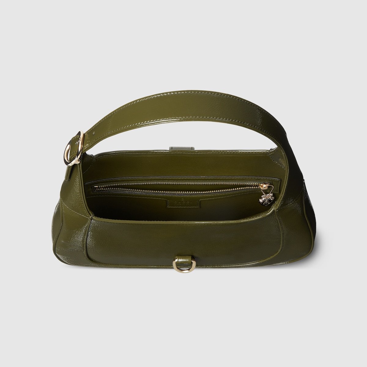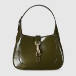In the Spring Summer 2025 collection, this Gucci Jackie 1961 small shoulder bag is crafted from forest green patent leather, complete with light gold-toned hook closure and an additional strap.