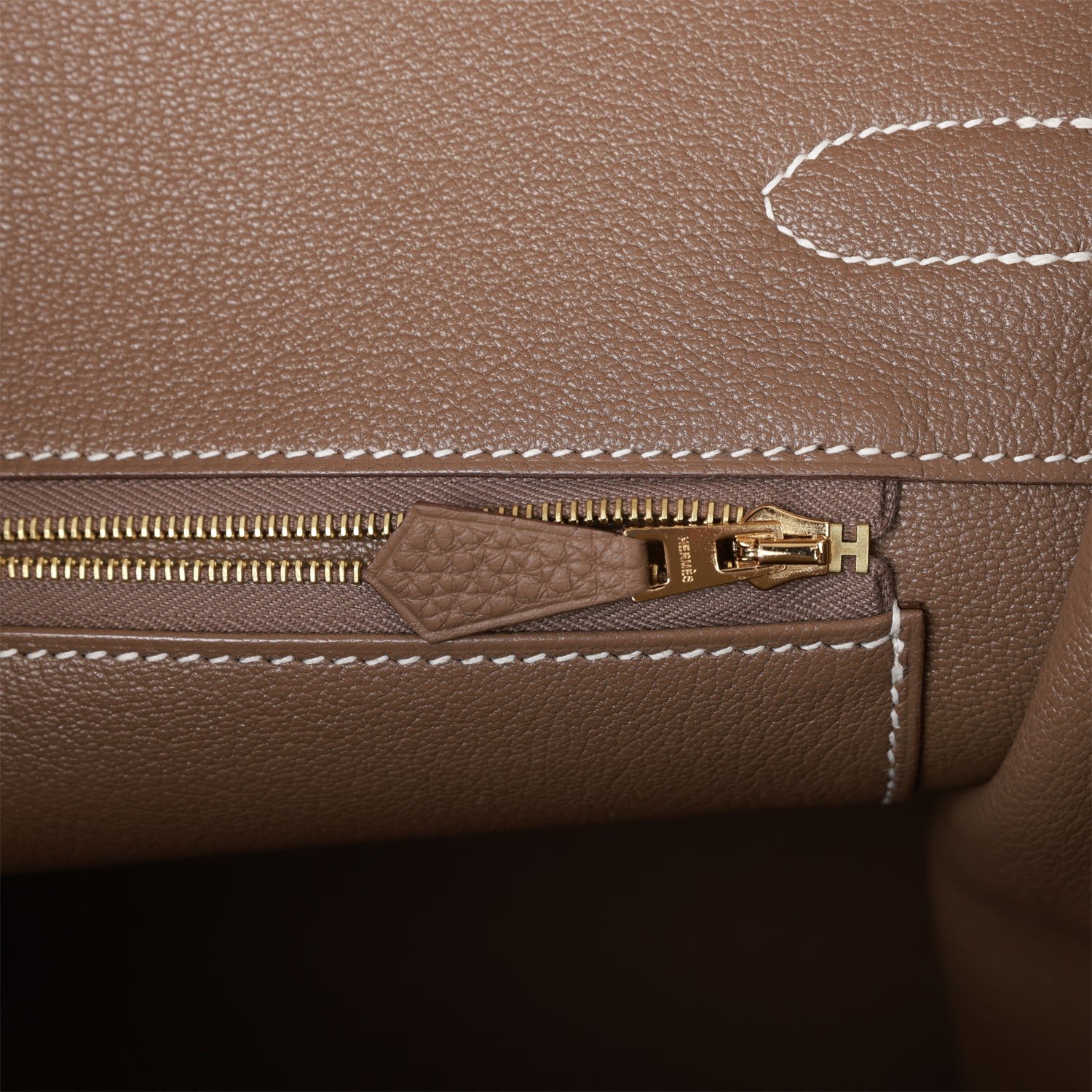 The interior is lined with Etoupe chevre and has one zip pocket with an Hermes engraved zipper pull and an open pocket on the opposite side.
