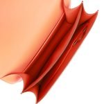 The interior is lined with Orange lambskin and has an open pocket on the front wall. a center divide. and a slit pocket on the back wall.