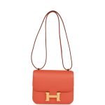 This Constance is in Orange swift leather with gold hardware and has tonal stitching. a metal H snap lock closure and adjustable shoulder strap.