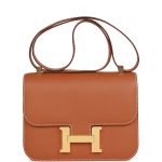 This Constance is in gold epsom leather with gold hardware and has contrast stitching. a metal H snap lock closure. and adjustable shoulder strap.