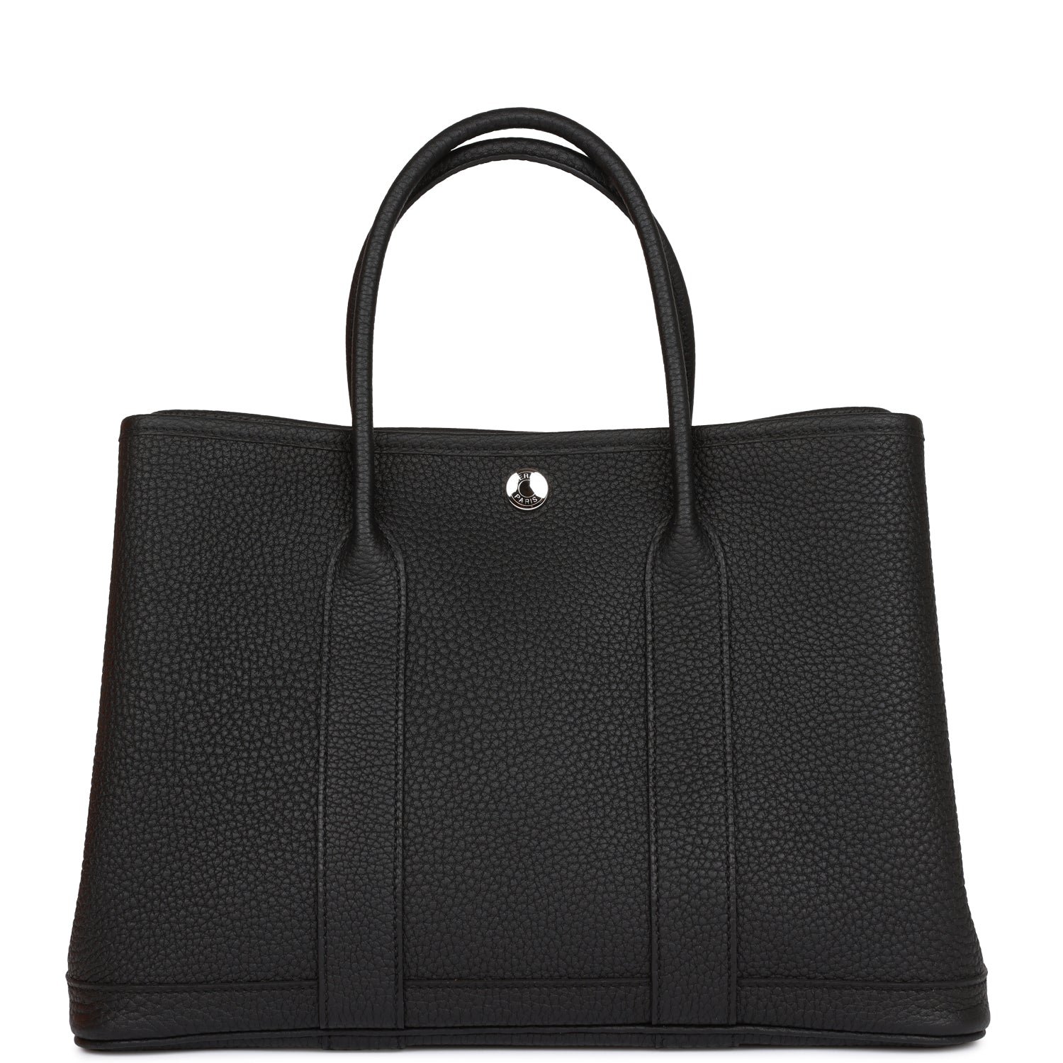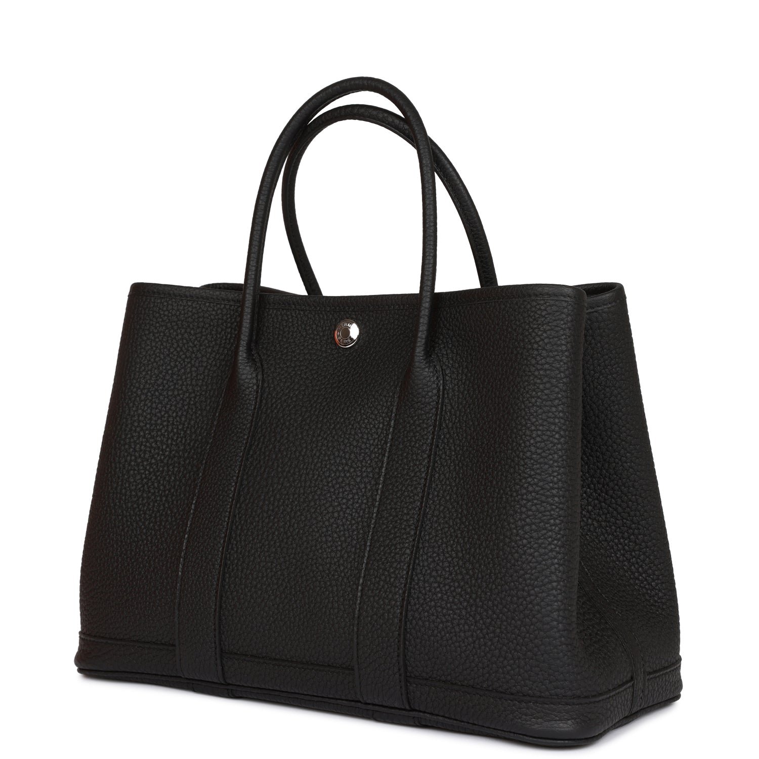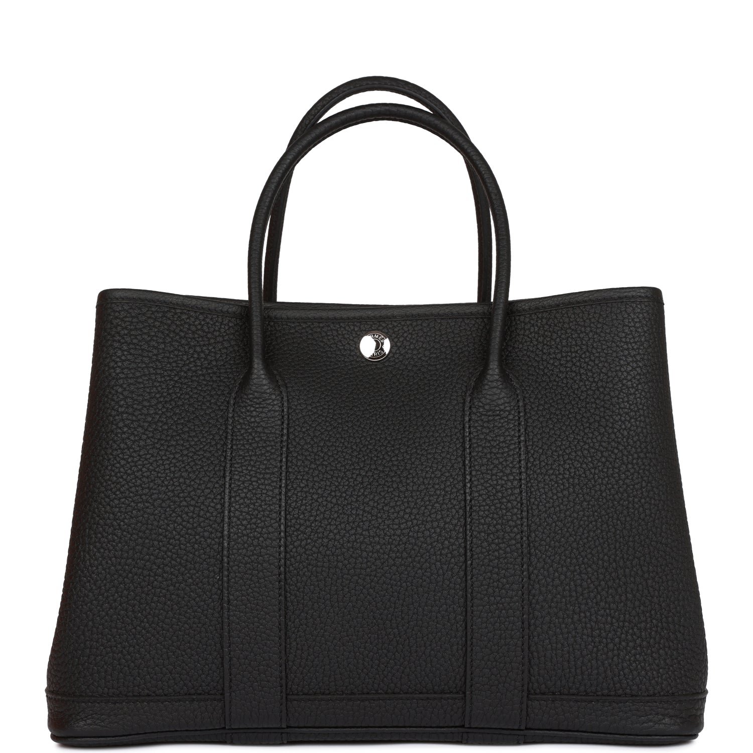 Hermes Garden Party 30cm of Black Negonda with palladium plated hardware and features tonal stitching. Clou de Selle snap closure and double rolled handles.