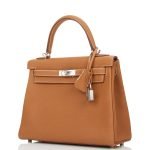 This Retourne Kelly is of gold togo leather with palladium hardware and has contrast stitching. front flap. two straps with center toggle closure. clochette with lock and two keys. single rolled handle and an optional shoulder strap.