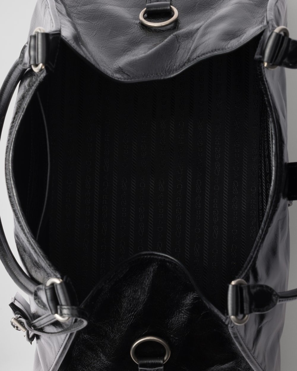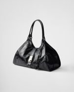 Geometric lines and refined artisan details define this bag with oversized volumes. The soft trapezoidal silhouette in leather is characterized by a delicate glossy finish with a vintage effect. The vertical clasp inspired by the archives and the leather mirror complete the accessory with a sophisticated note.