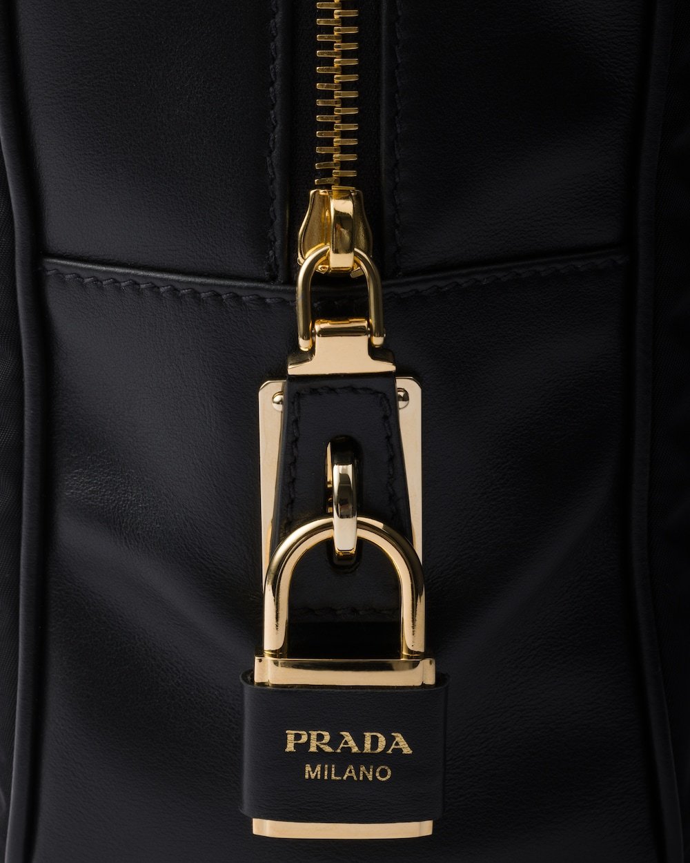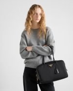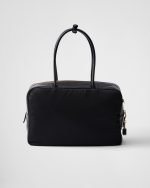 This structured top-handle bag, crafted from Re-Nylon and leather, presents a timeless silhouette with sophisticated charm. The metal hardware and the enameled metal triangle logo adorn the style, while the zipper and padlock closure add a unique accent.
