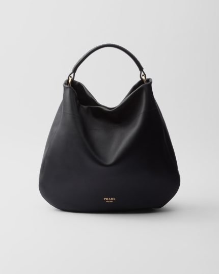 This versatile leather bag boasts a sleek and functional design. The shoulder strap adds a sporty element to the accessory, elevated by the metal logo lettering that stands out on the simple yet distinctive geometry of the iconic triangle.