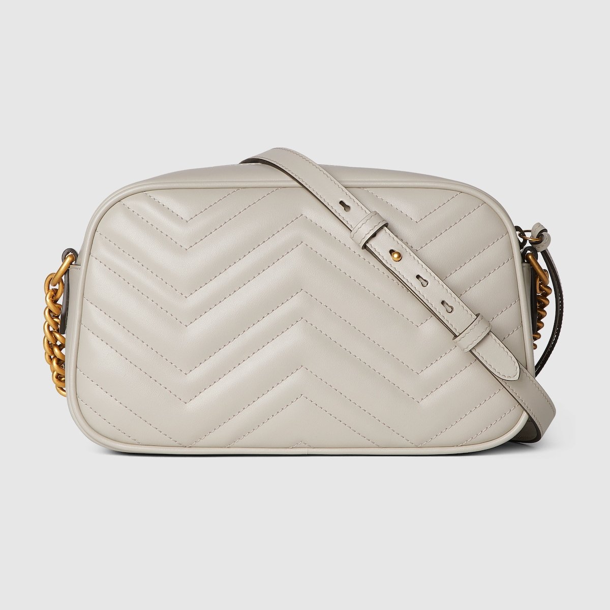 Made in matelassé chevron leather in a neutral shade of light grey, the now recognisable GG Marmont small shoulder bag has a softly structured shape and a flap closure with Double G hardware.