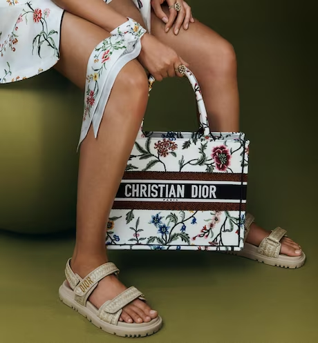 Introduced by Maria Grazia Chiuri, Creative Director of Christian Dior, the Dior Book Tote has become a staple of the Dior aesthetic. Designed to hold all daily essentials, the style is fully embroidered with a white multicolor Dior Petites Fleurs motif, a romantic and vibrant homage to Mr. Dior’s passion for florals. Adorned with the Christian Dior Paris signature on the front, the medium tote exemplifies the House’s signature savoir-faire and may be carried by hand or worn over the shoulder.