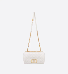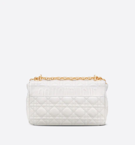 The Dior Caro bag combines modernity with timeless elegance. The medium silhouette is crafted in ivory calfskin with Cannage topstitching. The supple bag features a flap adorned with an antique gold-finish metal ‘CD’ twist clasp, inspired by the seal of a Christian Dior perfume bottle. The detachable chain shoulder strap with ‘CD’ signature links allows the bag to be carried by hand or worn over the shoulder and may be replaced by one of the House’s wide embroidered straps for day or evening attire wear.