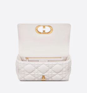The Dior Caro bag combines modernity with timeless elegance. The design is crafted in latte matte calfskin and is distinguished by its original quilted-effect Macrocannage stitching. The bag features a flap adorned with an antique gold-finish metal ‘CD’ twist clasp, inspired by the seal of a Christian Dior perfume bottle. The detachable chain shoulder strap with ‘CD’ signature links allows the medium bag to be carried by hand or worn over the shoulder and may be replaced by one of the House’s wide embroidered straps for day or evening attire.