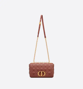 The Dior Caro bag combines modernity with timeless elegance. The design is crafted in rust-colored calfskin with Cannage stitching. The supple bag features a flap adorned with an antique gold-finish metal ‘CD’ twist clasp, inspired by the seal of a Christian Dior perfume bottle. The detachable chain strap with ‘CD’ signature links allows it to be carried by hand, worn over the shoulder or crossbody. It may be replaced by one of the House’s wide embroidered straps, allowing the medium bag to pair with day or evening attire.