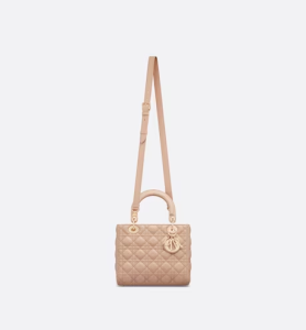 The Lady Dior bag epitomizes the House’s vision of elegance and beauty. Sleek and refined, the timeless style is crafted in Sand pink lambskin with Cannage stitching, creating the immediately recognizable quilted texture. Pale gold-finish metal D.I.O.R. charms add an elegant touch. Featuring a removable thin leather shoulder strap, the medium Lady Dior bag can be carried by hand or worn crossbody.