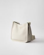 This versatile leather bag boasts a sleek and functional design. The shoulder strap adds a sporty element to the accessory, elevated by the metal logo lettering that stands out on the simple yet distinctive geometry of the iconic triangle.