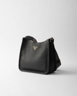 This versatile leather bag boasts a sleek and functional design. The shoulder strap adds a sporty element to the accessory, elevated by the metal logo lettering that stands out on the simple yet distinctive geometry of the iconic triangle.