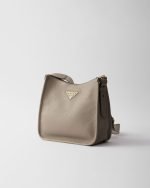 This versatile leather bag boasts a sleek and functional design. The shoulder strap adds a sporty element to the accessory, elevated by the metal logo lettering that stands out on the simple yet distinctive geometry of the iconic triangle.