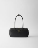 This leather top-handle bag features a modern design with refined details and a versatile style. Its sleek geometric silhouette, complemented by long handles for effortless wear on the shoulder, is enhanced with metal logo lettering.