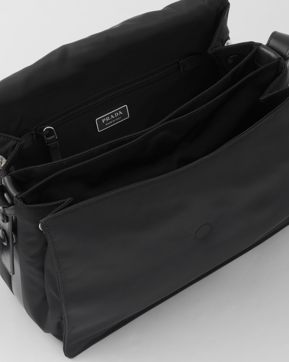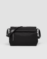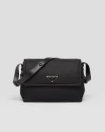 This shoulder bag made of padded Re-Nylon, the distinctive innovative material of the brand, comes with a leather shoulder strap. The accessory completed by a back pocket is illuminated with metal hardware and is decorated with the enameled metal triangle logo that stands out on the flap.