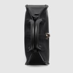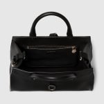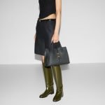 This medium tote design continues to feature the snap hook closure, first introduced in the Spring Summer 2024. The sophisticated leather in black has a distinctive natural grain. The top handle bag’s open compartment has a hook closure strap, and comes with a detachable and adjustable shoulder strap.