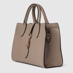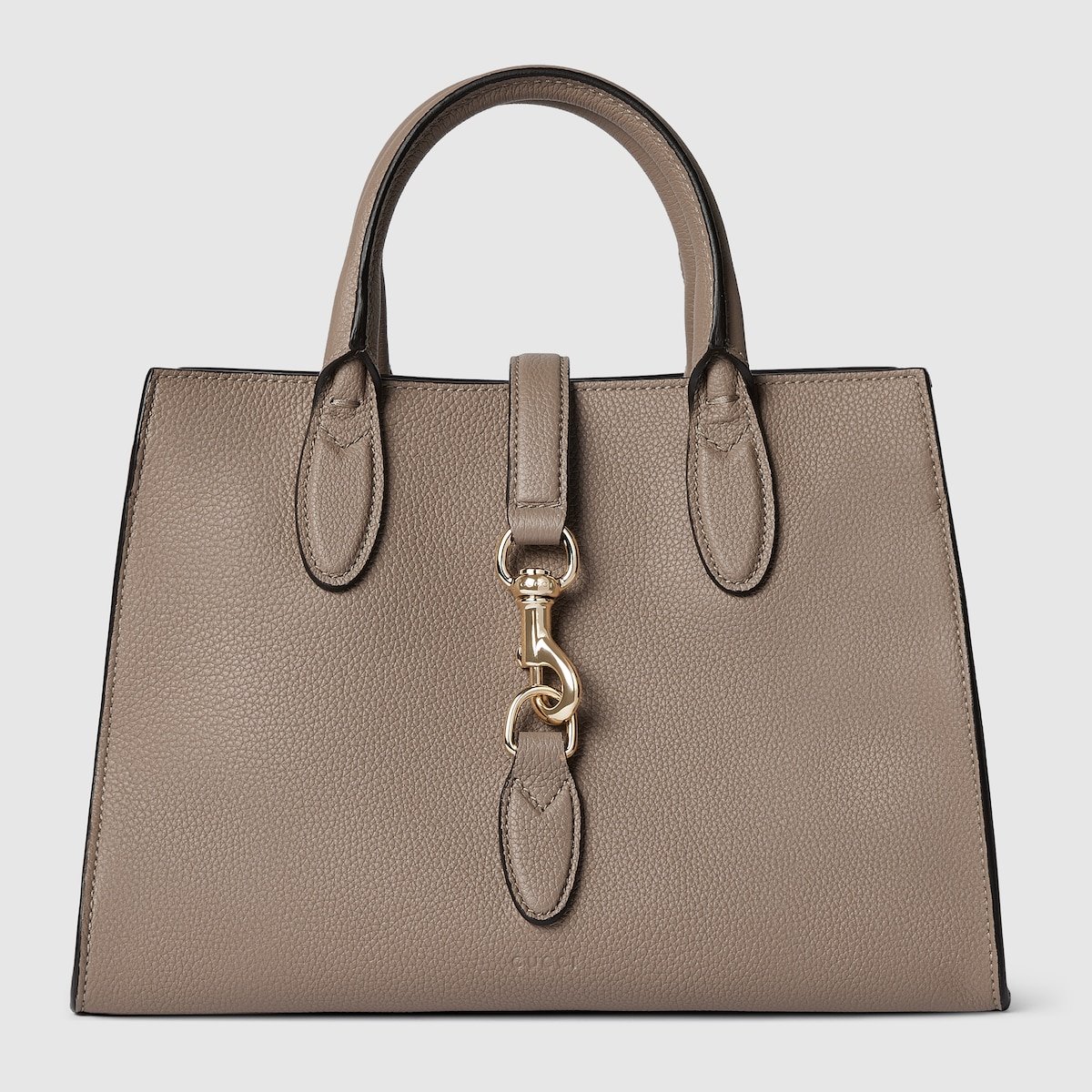 This medium tote design continues to feature the snap hook closure, first introduced in the Spring Summer 2024. The sophisticated leather in taupe has a distinctive natural grain. The top handle bag’s open compartment has a hook closure strap, and comes with a detachable and adjustable shoulder strap.