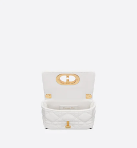 The Dior Caro bag is a creation that combines modernity and timeless elegance. Crafted in latte supple calfskin with Cannage stitching, it features a flap adorned with a ‘CD’ clasp, inspired by the seal of a Christian Dior perfume bottle. The miniature shape’s chain shoulder strap has a leather insert that provides a comfortable and adjustable carry, to be worn with day or evening attire.