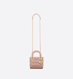 The Lady Dior handbag epitomizes the House’s vision of elegance and beauty. Refined and sleek, the timeless creation is crafted in blush lambskin and covered with Cannage stitching, creating an instantly recognizable quilted texture. The pale gold-finish metal D.I.O.R. charms embellish and illuminate its silhouette. Featuring a removable chain shoulder strap, the miniature Lady Dior bag can be carried by hand or worn crossbody as an ideal evening wear companion.