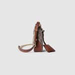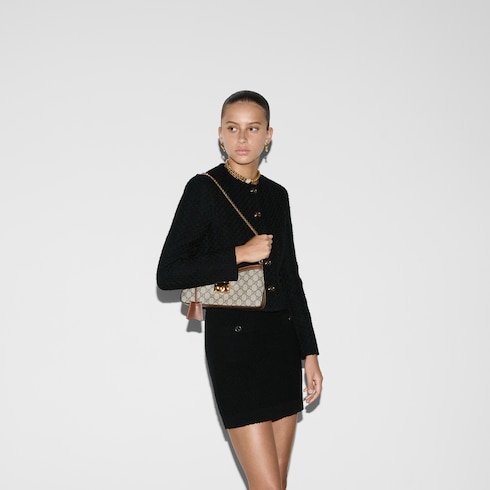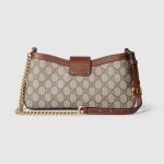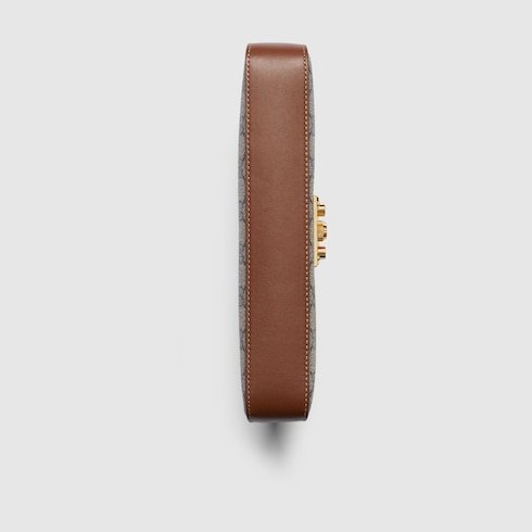 Drawing from the House’s origins as an artisanal luggage atelier, the Padlock closure features prominently on this small shoulder bag in beige and ebony GG Supreme canvas, with brown leather trim, and a new adjustable leather and chain strap. It is complete with gold-toned hardware and key with leather holder.