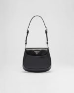 A perfect synthesis of classicism and futurism, the Prada Cleo bag reinterprets an iconic design from the brand’s archives. Sleek, curved lines emphasized by the particular sloping construction on the bottom and sides give this flap bag sophisticated allure, while the handle with extension makes the accessory functional and allows it to be worn as a shoulder bag or handbag. Brushed leather, a distinctive material of Prada collections, is a modern, chameleonic material that is perfect for always new combinations and contrasts. The enameled triangle logo completes the silhouette.