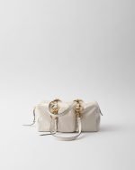 A new interpretation of the top-handle bag features a soft geometric shape and is made of shiny leather with a vintage finish. Its retro charm is emphasized by the antiqued metal hardware and the archive-inspired zipper pocket.