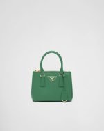 Production of the Prada Galleria bag, composed of 83 pieces, is an authentic fusion between industrial precision and the refined accuracy of craftsmanship that can only be performed by hand. The design is clean and elegant yet innately pragmatic, an aesthetic language blending form and function that combines history and modernity. Originating the definition of “timeless”, the Galleria bag has become a hallmark of Prada’s identity in the twenty-first century. The accessory, presented in the mini version, is made of iconic Saffiano leather that was patented by the founder of the brand and features a crosshatch texture and waxed finish.