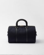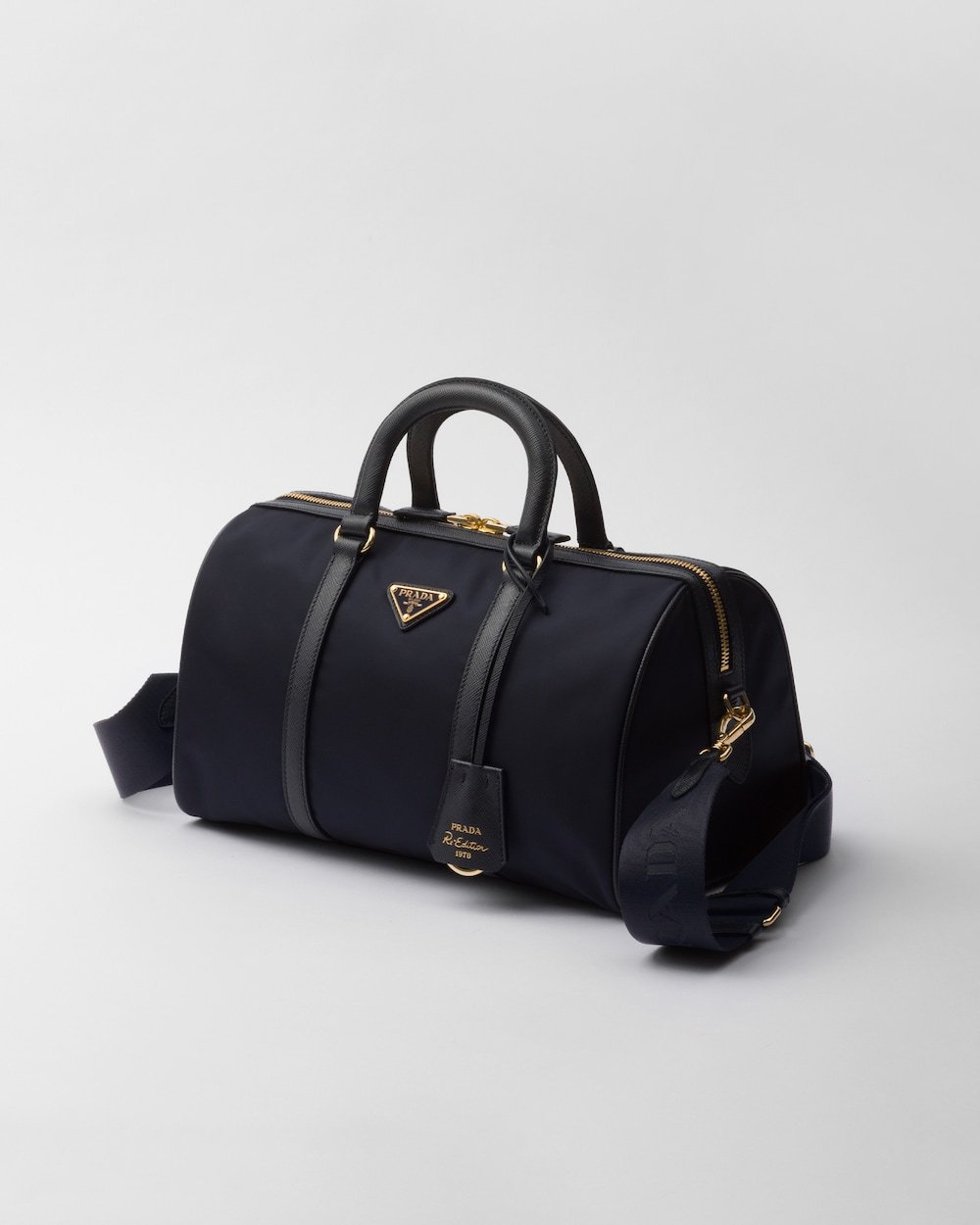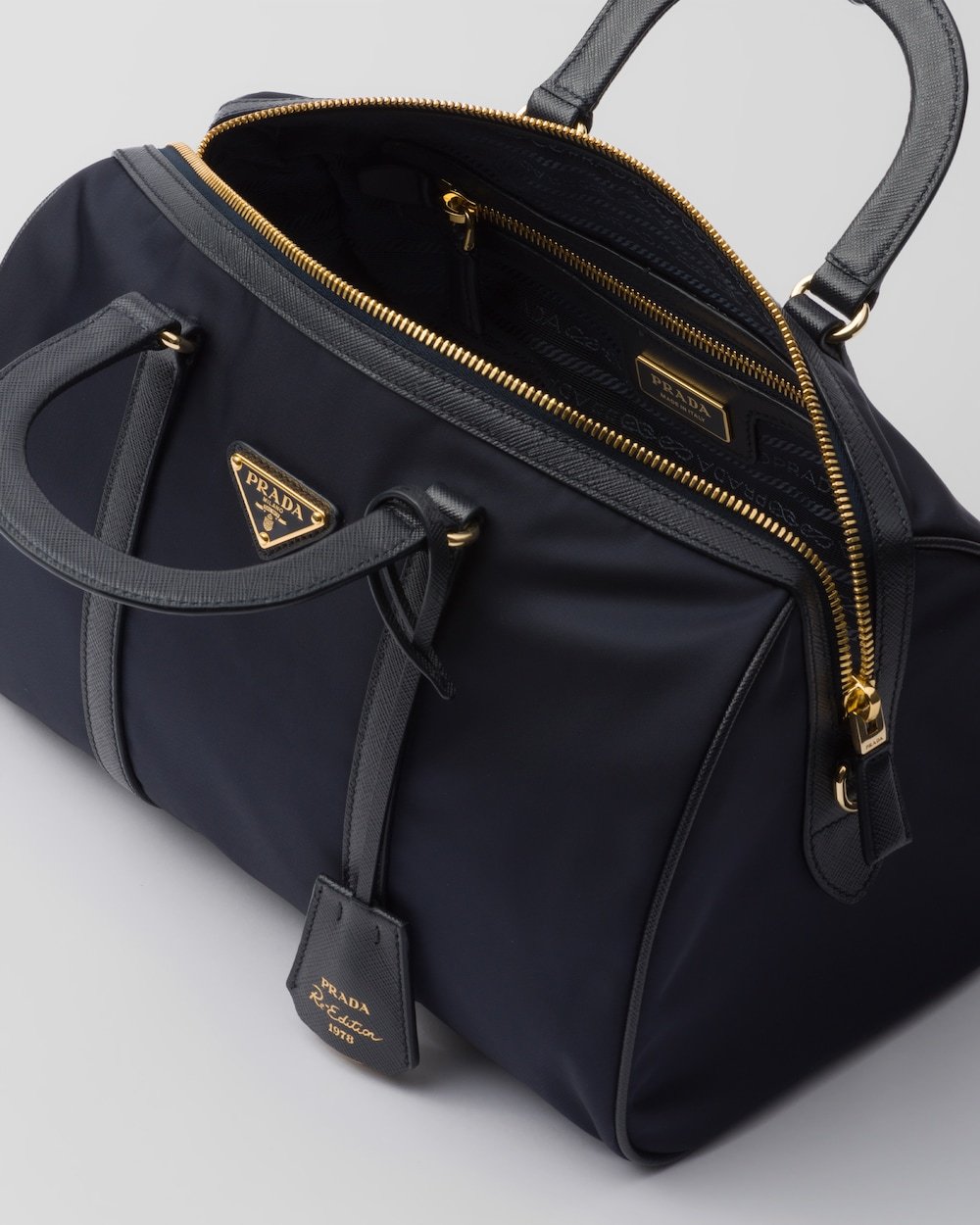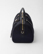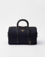 An archive silhouette with timeless allure is reinterpreted with a contemporary design, emphasized by the exclusive combination of two of Prada’s iconic materials. Made of Re-Nylon, the innovative regenerated and sustainable nylon fabric, the top-handle bag with a structured shape is enriched with elegant details in Saffiano leather and metal hardware. The pragmatic but sophisticated accessory is embellished with the enameled metal triangle logo.