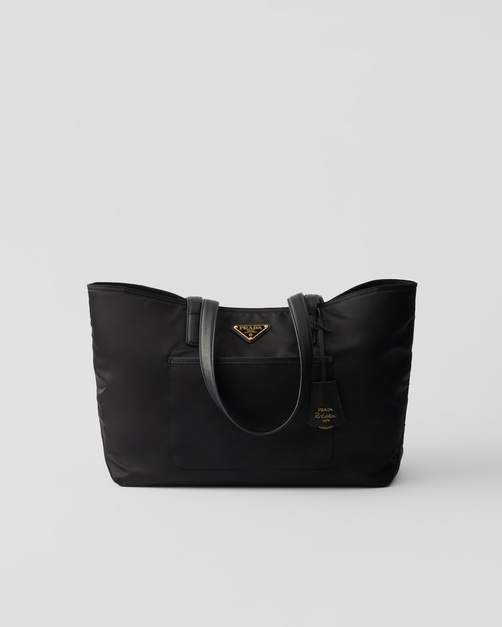 This tote bag with timeless charm, a re-edition of an archive design, sums up Prada codes in a sophisticated and pragmatic silhouette. The style with clean lines is made of Re-Nylon, an innovative regenerated nylon fabric that is the sustainable evolution of a distinctive material of the brand. Elegant Saffiano leather details complete the roomy accessory decorated with the iconic signature touch of the enameled metal triangle logo.
