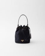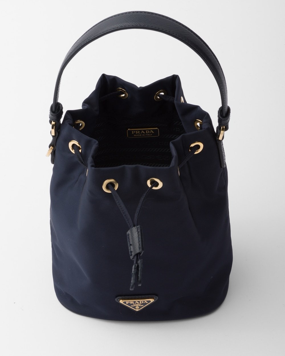 Functional and innovative Re-Nylon is the sustainable evolution of a distinctive material in Prada’s DNA, an expression of the brand’s original and unconventional aesthetic. This mini-bag made of regenerated nylon has an iconic bucket silhouette, a Re-Edition of an archive style, decorated with leather details and metal hardware. The exclusive and refined accessory, carried by a hand or worn with the removable shoulder strap, is embellished with the enameled metal triangle logo.