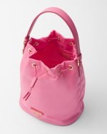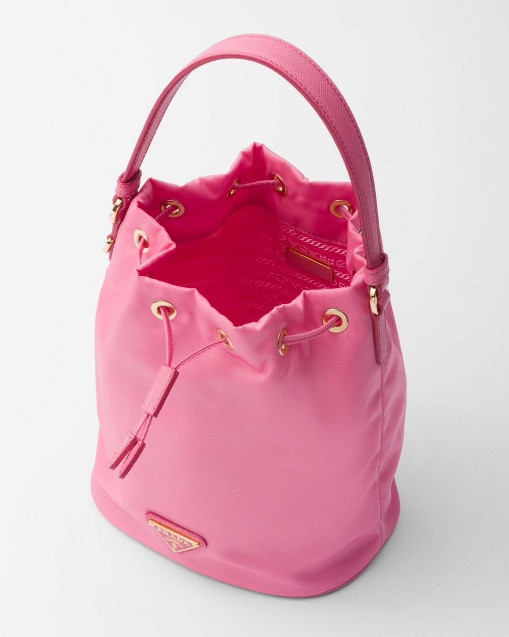 Functional and innovative Re-Nylon is the sustainable evolution of a distinctive material in Prada’s DNA, an expression of the brand’s original and unconventional aesthetic. This mini-bag made of regenerated nylon has an iconic bucket silhouette, a Re-Edition of an archive style, decorated with leather details and metal hardware. The exclusive and refined accessory, carried by a hand or worn with the removable shoulder strap, is embellished with the enameled metal triangle logo.