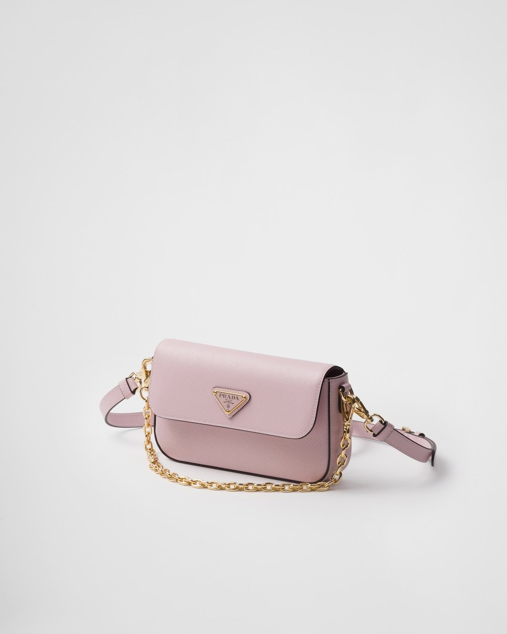 The unmistakable crosshatch pattern with waxed finish of Saffiano leather, Prada’s iconic material, embellishes this mini bag with a sleek, sophisticated silhouette. The compact style with adjustable shoulder strap has an elegant removable chain handle for versatile wear. The accessory brightened by metal hardware is completed by the distinctive signature of the enameled metal triangle logo.