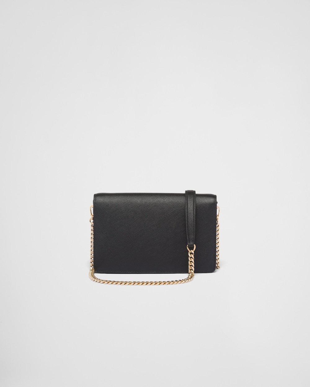 This shoulder bag with a feminine design and flap is made of Saffiano leather. The accessory is embellished with enameled metal triangle logo that decorates the tip of the flap closure. The bag, with versatile yet sophisticated allure, is completed by a back pocket and adjustable Saffiano leather handle.