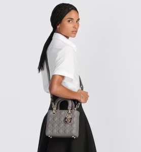 The Lady Dior My ABCDior bag epitomizes Dior’s vision of elegance and beauty. Sleek and refined, the timeless style is crafted in steel gray lambskin with Cannage stitching, creating the instantly recognizable quilted texture. Pale gold-finish metal D.I.O.R. charms offer elegant appeal. Featuring a shoulder strap that can be personalized with badges, the small, unique design may be carried by hand or worn crossbody.